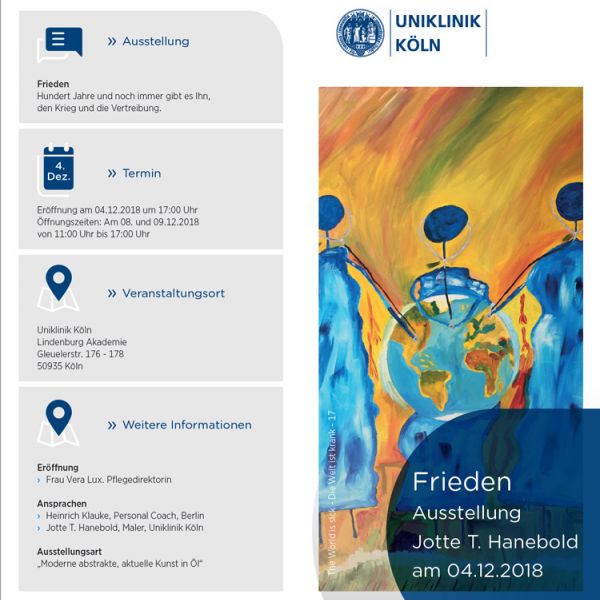 Ich bin immer auf der Suche nach Ausstellungsorten für meine Werke. Mein größter Erfolg und gleichzeitig auch die letzte größere Ausstellung war meine Ausstellung "Frieden" in der Uniklinik in Köln.