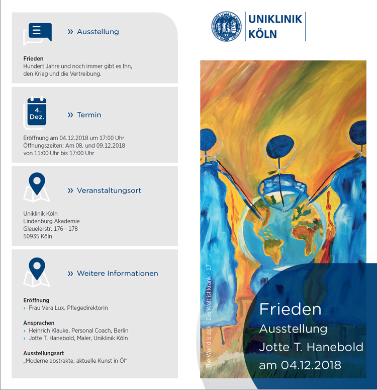 Ich bin immer auf der Suche nach Ausstellungsorten für meine Werke. Mein größter Erfolg und gleichzeitig auch die letzte größere Ausstellung war meine Ausstellung "Frieden" in der Uniklinik in Köln.