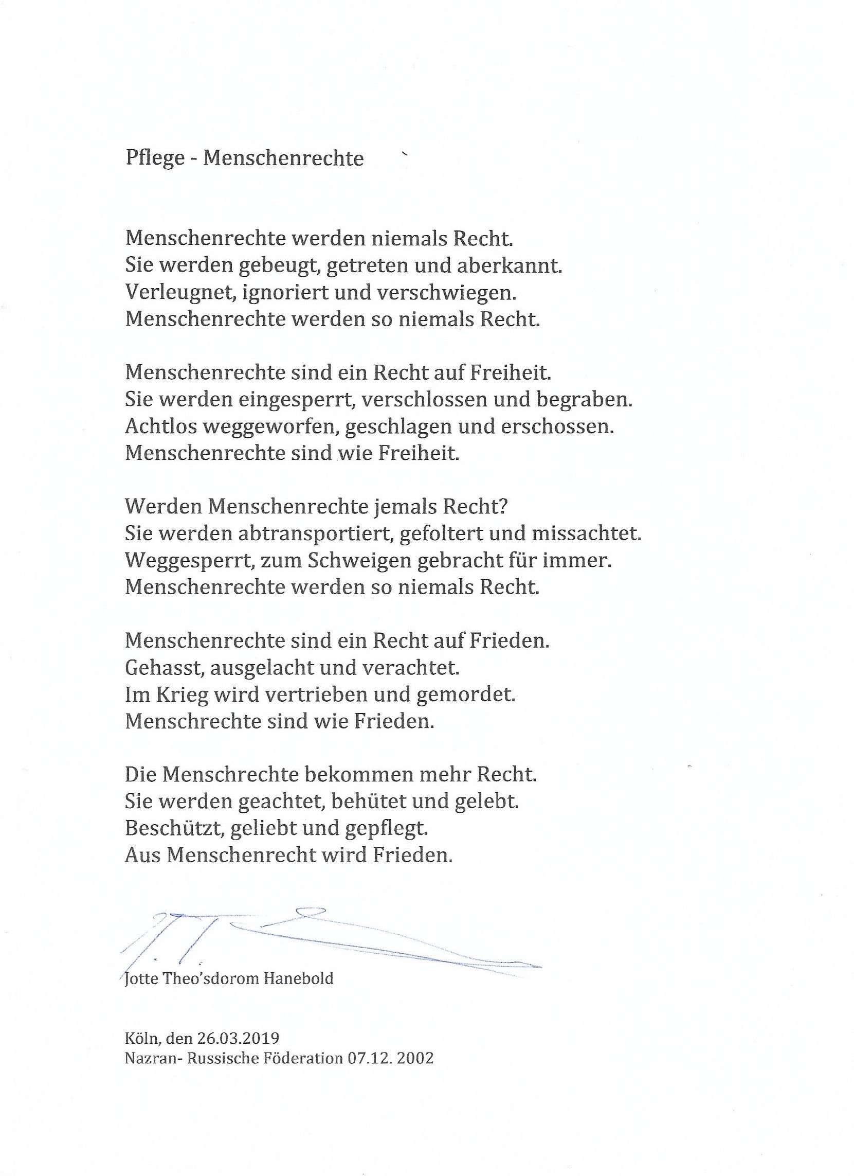 Erste Versuche mein Inneres, also was mich gedanklich beschäftigt, auszudrücken begannen 2002 in Nazran/Inguschetien in der Russischen Föderation. Dort habe ich Gedichte geschrieben, die durch Krieg entstanden sind, um die ganze, unglaublich brutal verübte, Gewalt unter Menschen in Wörter zufassen. Es wiederholt sich Alles. Frieden und Gewaltlosigkeit scheinen nur leere historische Wörter zu sein.